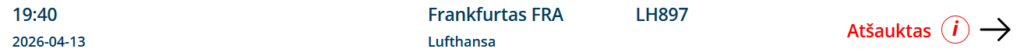 Pagal ryto duomenis, šiandien iš Vilniaus – numatyti du Lufthansa skrydžiai, vienas jų, į Frankfurtą jau atšauktas. Kitas skrydis kol kas nėra atšauktas, tačiau situacija gali keistis priklausomai nuo oro linijų sprendimų.
