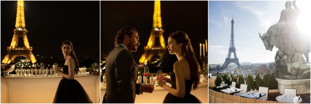 Terasa su vaizdu į Eifelio bokštą, kur vyksta reklamos kampanija ir vakarėlio scenos. Emily bendrauja su draugais, o vieta suteikia elegancijos ir glamūro pojūtį. Scenos čia perteikia Paryžiaus stilių ir socialinį gyvenimą.