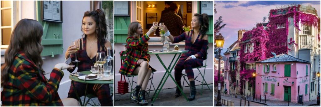 Montmartre rožinis namelis – scena su draugių vakariene ir reklamos filmavimu. Emily vaikšto gatvėmis Rue de l’Abreuvoir, kur seriale matome jos kasdienybę ir kūrybingą miesto atmosferą.