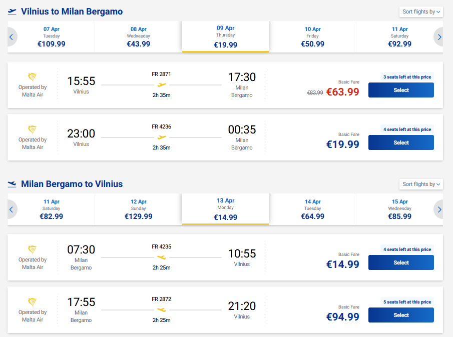 Pigūs sezono skrydžiai į Milaną, Italiją tiesiogiai iš Vilniaus ir atgal su „Ryanair“ oro linijomis.