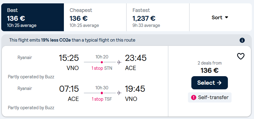 Vilnius – Lansarotė – Vilnius (su persėdimu)