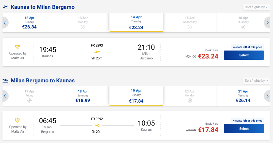 Pigūs sezono skrydžiai į Milaną, Italiją tiesiogiai iš Kauno ir atgal su „Ryanair“ oro linijomis.