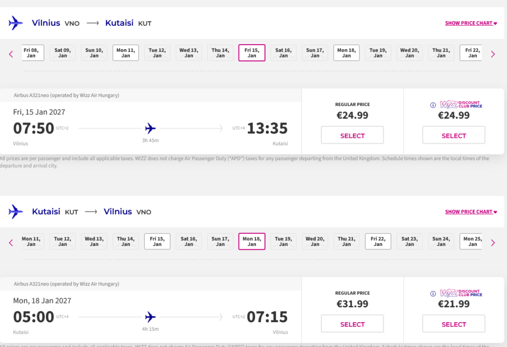 Pigūs skrydžiai į Kutaisį, Sakartvelą tiesiogiai iš Vilniaus ir atgal su „Wizzair“ oro linijomis.