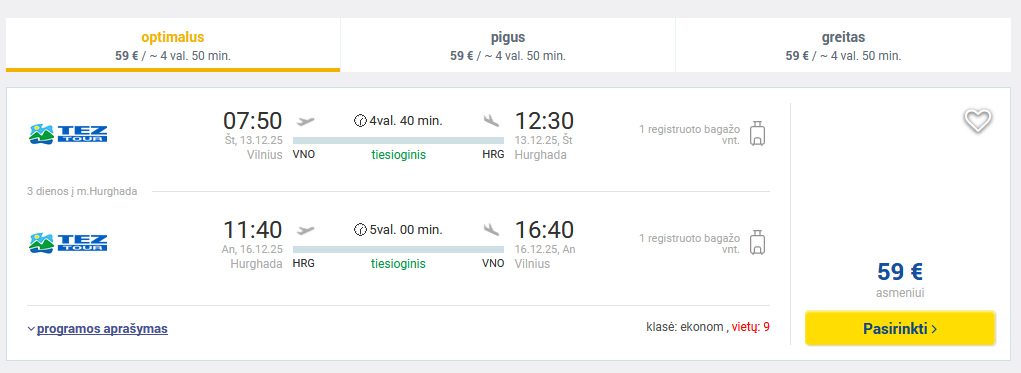 Pigūs tiesioginiai skrydžiai į Hurgadą bei Šarm el Šeichą iš Vilniaus ir atgal su „TezTour“.