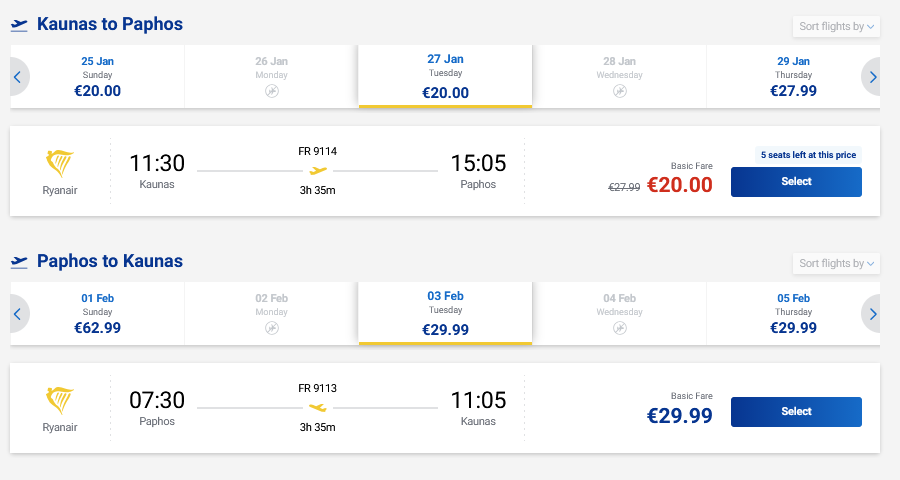 Pigūs skrydžiai į Pafosą, Kiprą tiesiogiai iš Kauno ir atgal su „Ryanair“ oro linijomis.