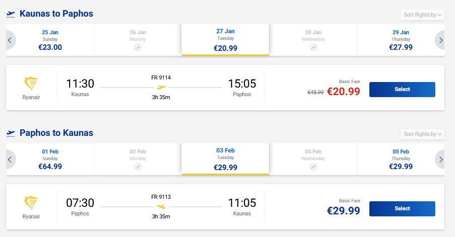 Pigūs skrydžiai į Pafosą, Kiprą tiesiogiai iš Kauno ir atgal su „Ryanair“ oro linijomis.