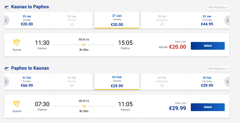 Pigūs skrydžiai į Pafosą, Kiprą tiesiogiai iš Kauno ir atgal su „Ryanair“ oro linijomis.