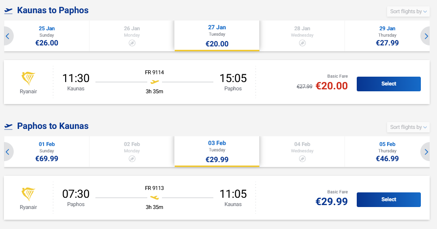 Pigūs skrydžiai į Pafosą, Kiprą tiesiogiai iš Kauno ir atgal su „Ryanair“ oro linijomis.