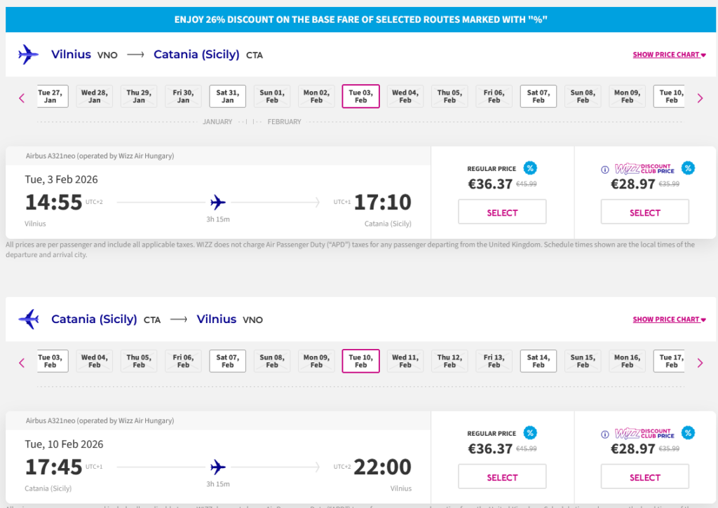 Pigūs skrydžiai į Kataniją, Siciliją tiesiogiai iš Vilniaus ir atgal su „Wizzair“ oro linijomis.