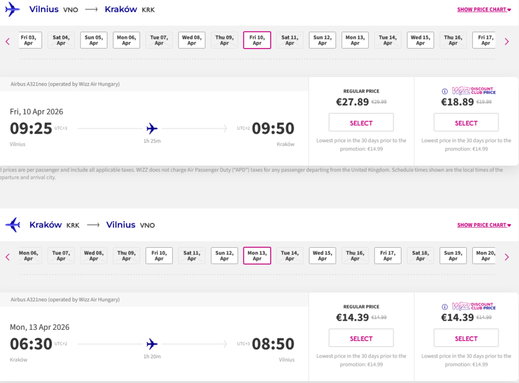 Skrydžio kaina: nuo €33 (su Wizzair nuolaidu kortele, be kortelės nuo €42)