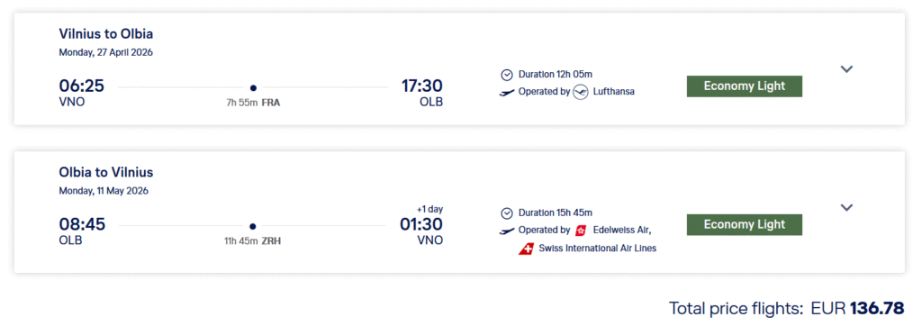 Skrydžiai į Olbiją, Sardiniją iš Vilniaus ir atgal su „Lufthansa“ oro linijomis.