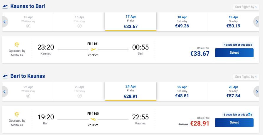 Skrydžiai sezono metu į Barį, Italiją tiesiogiai iš Kauno ir atgal su „Ryanair“ oro linijomis.