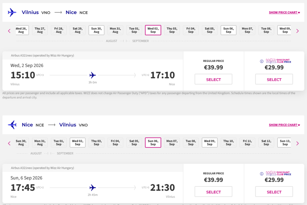 Pigūs sezono metu skrydžiai į Nicą, Prancūziją tiesiogiai iš Vilniaus ir atgal su „Wizzair“ oro linijomis.