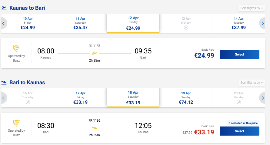 Pigūs skrydžiai į Barį, Italiją tiesiogiai iš Kauno ir atgal su „Ryanair“ oro linijomis.