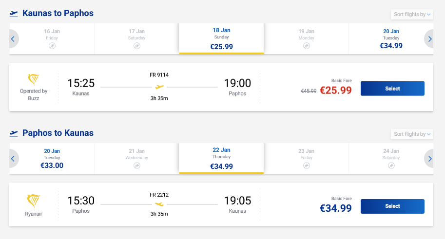 Pigūs skrydžiai į Pafosą, Kiprą tiesiogiai iš Kauno ir atgal su „Ryanair“ oro linijomis.