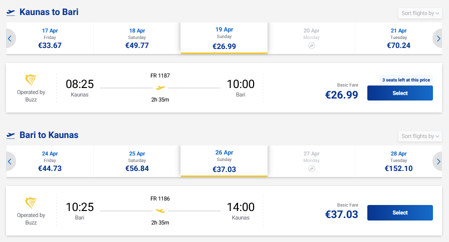 Skrydžiai į Barį, Italiją tiesiogiai iš Kauno ir atgal su „Ryanair“ oro linijomis.
