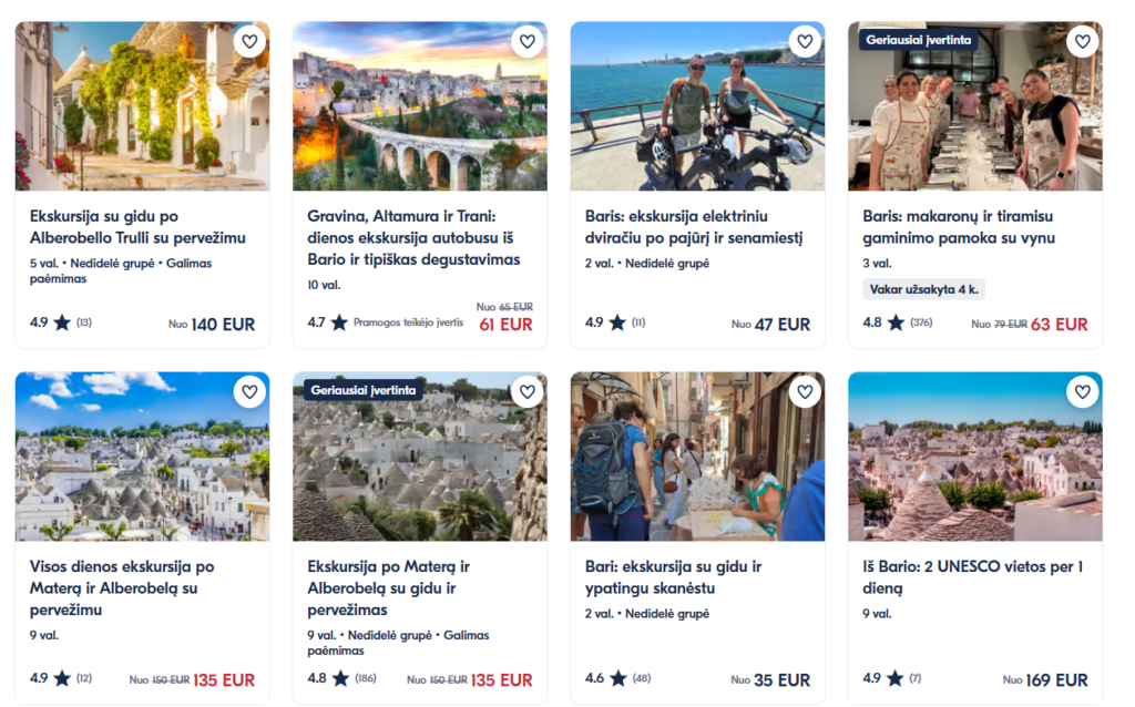 Bet kuriame pasaulio kampelyje užsisakykite pramogas, turus ar veiklas, kurios Jūsų kelionę pavers išskirtine. Nuo apsilankymo Laisvės statuloje iki turo Romoje, užsisakykite: GetYourGuide, Expedia, Tripadvisor