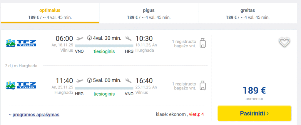 Pigūs tiesioginiai skrydžiai į Hurgadą, Egiptą iš Vilniaus ir atgal su „TezTour.