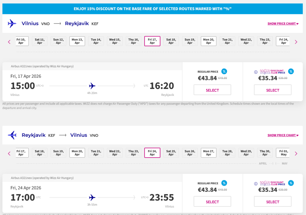 Kaina nurodyta su Wizzair nuolaidų kortele, be kortelės kaina nuo €87.