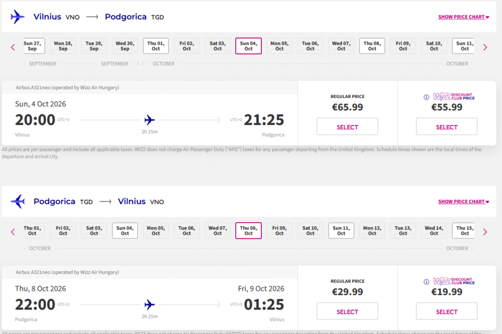 Pigūs skrydžiai į Podgoricą, Juodkalniją tiesiogiai iš Vilniaus ir atgal su „Wizzair“ oro linijomis.