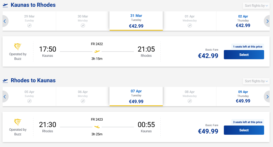 Skrydžiai sezono metu į Rodo salą tiesiogiai iš Kauno ir atgal su „Ryanair“ oro linijomis.