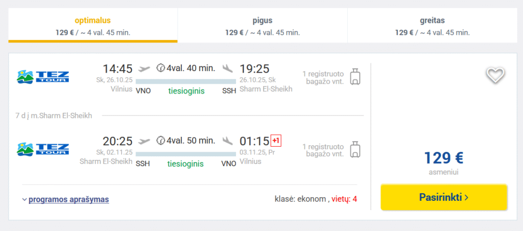 Pigūs skrydžiai į Šarm El Šeichą tiesiogiai iš Vilniaus ir atgal su „TezTour“ agentūra.