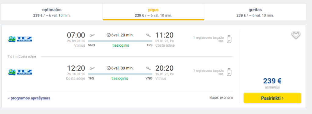 Tiesioginiai skrydžiai į Tenerifę iš Vilniaus į abi puses bei registruotu bagažu su „TezTour“.