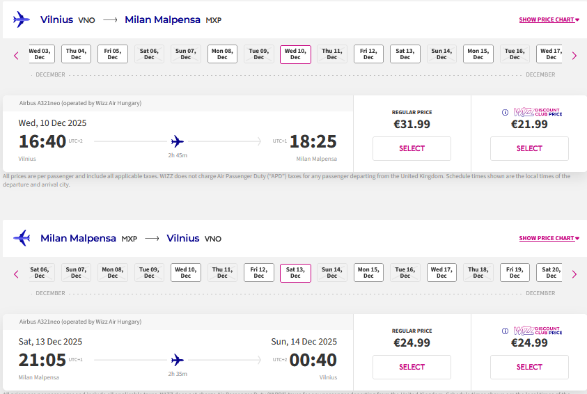 Vilnius – Milanas – Vilnius