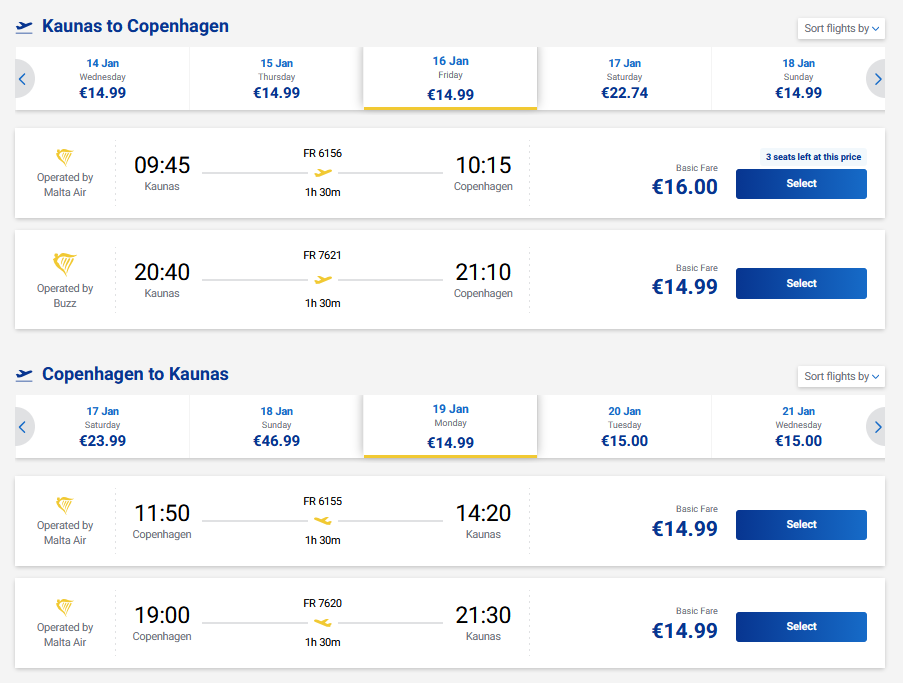 Pigūs skrydžiai į Kopenhagą, Daniją tiesiogiai iš Kauno ir atgal su „Ryanair“ oro linijomis.