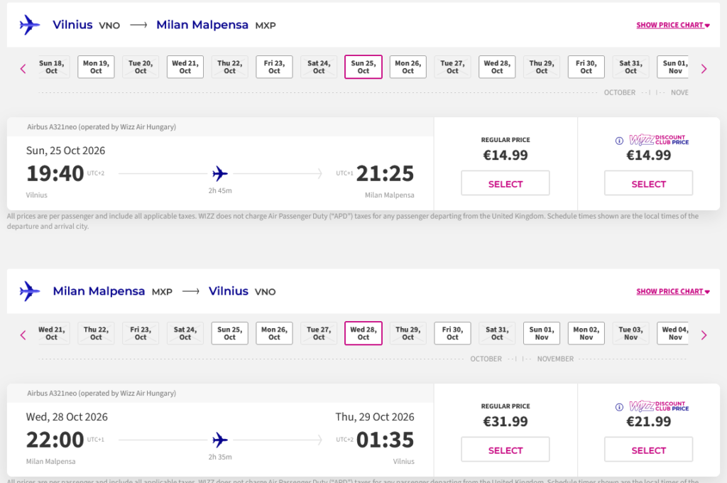 Sezono skrydžiai į Milaną, Italiją tiesiogiai iš Vilniaus ir atgal su „Wizzair“ oro linijomis.