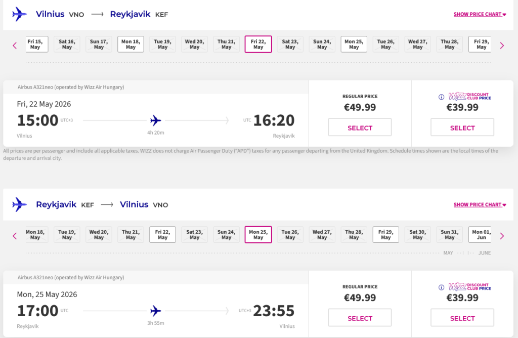 Kaina nurodyta su Wizzair nuolaidų kortele, be kortelės kaina nuo €100.