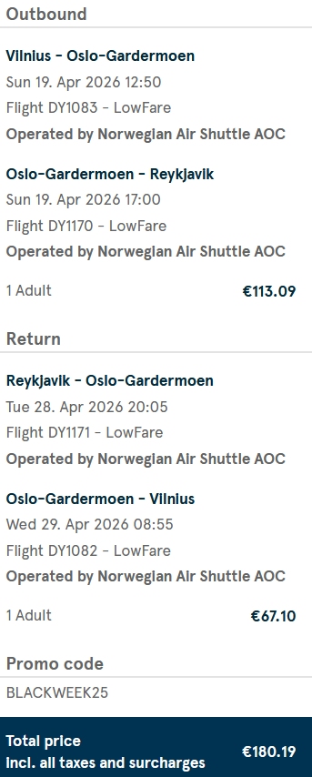 Skrydžiai į Reikjaviką, Islandiją iš Vilniaus ir atgal su „Norwegian“ oro linijomis.