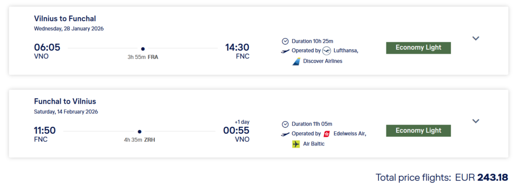 Vilnius – Funšalis – Vilnius (su persėdimu)