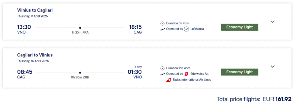 Skrydžiai į Kaljarį, Sardiniją iš Vilniaus ir atgal su „Lufthansa“ oro linijomis.