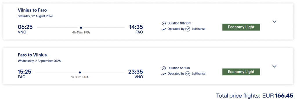 Skrydžiai sezono metu į Faro, Portugaliją iš Vilniaus ir atgal su „Lufthansa“ oro linijomis.