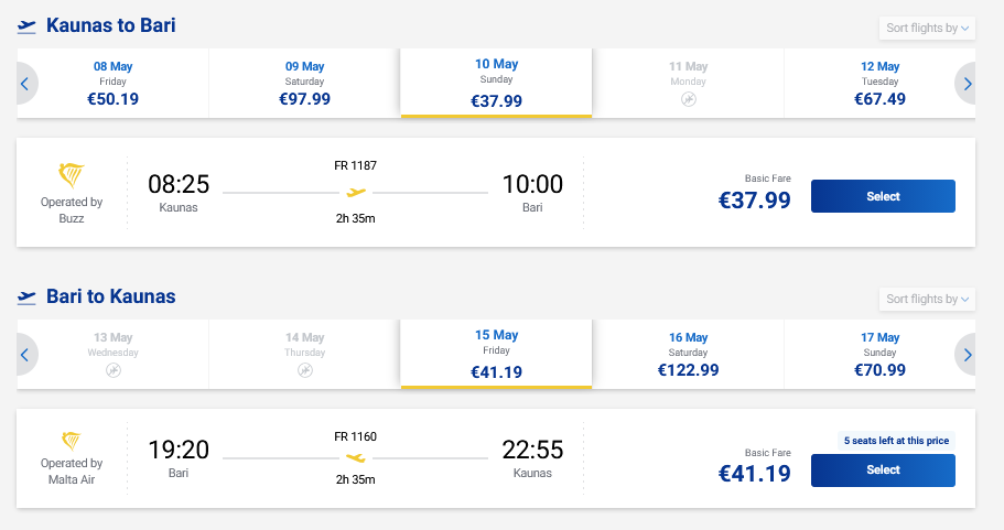 Skrydžiai į Barį, Italiją tiesiogiai iš Kauno ir atgal su „Ryanair“ oro linijomis.