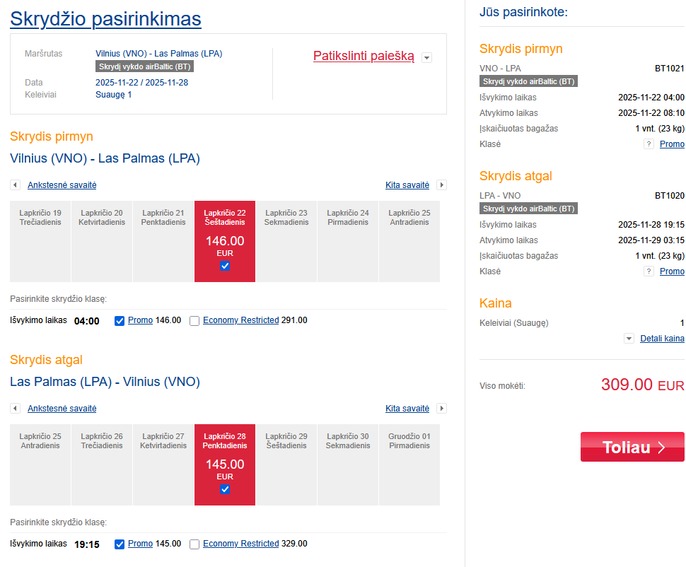 Lėktuvo bilietus užsisakyti galite puslapyje skrydžių paieška arba oficialioje oro linijų svetainėje. Paspaudę nuorodą įveskite nurodytą maršrutą bei datą ir matysite mūsų kelionės pasiūlymą oficialiame oro linijų puslapyje. Beliks rezervuoti ir mėgautis savo kelione.