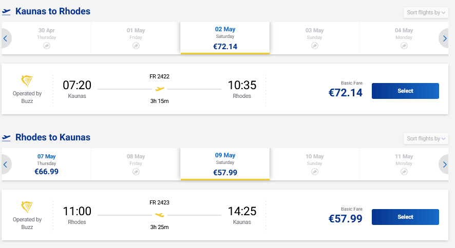 Skrydžiai sezono metu į Rodo salą tiesiogiai iš Kauno ir atgal su „Ryanair“ oro linijomis.