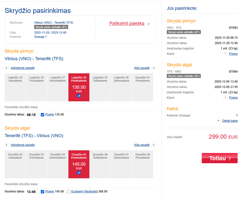 Tiesioginiai skrydžiai į Tenerifę iš Vilniaus į abi puses bei registruotu bagažu su „Novaturas“.