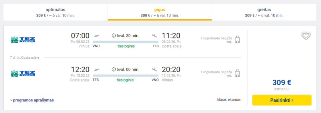 Tiesioginiai skrydžiai į Tenerifę iš Vilniaus į abi puses bei registruotu bagažu su „TezTour“.