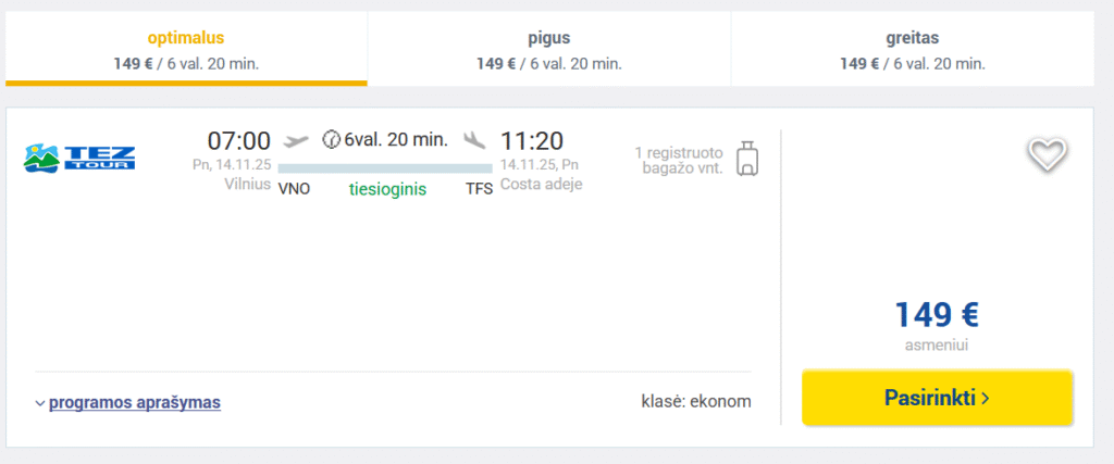 Pigūs skrydžiai į Tenerifę tiesiogiai iš Vilniaus į vieną pusę su „Teztour“ agentūra.