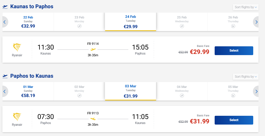Pigūs skrydžiai į Pafosą, Kiprą tiesiogiai iš Kauno ir atgal su „Ryanair“ oro linijomis.