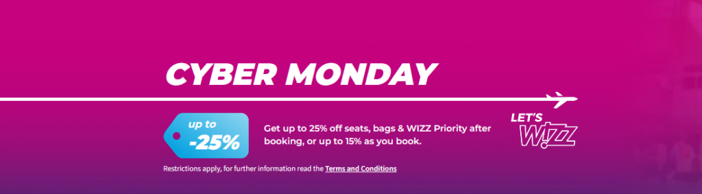 Wizzair skelbia Cyber Monday – bilietams taikoma iki -25% nuolaida. Puiki proga suplanuoti žiemos ar ankstyvo pavasario kelionę už itin mažą kainą.