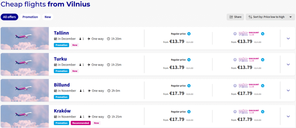 Jei ieškai pigių skrydžių trumpam savaitgalio pabėgimui ar žiemos atostogoms, dabar pats metas veikti – tokios akcijos dažniausiai trunka tik vieną dieną. Patikrink Wizzair pasiūlymus ir susirask bilietus, kol dar yra vietų už mažiausią kainą.